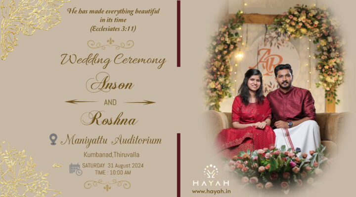Anson & Roshna’s Wedding Ceremony | 31 August 2024 | Live from Maniyattu Auditorium, Kumbanad Witness the sacred union of Anson and Roshna as they exchange vows on 31 August 2024 starting at 10:30 AM