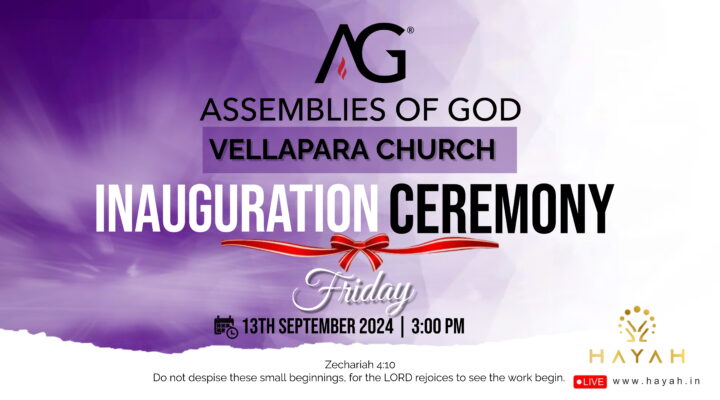 Assemblies of God Vellapara Church Inauguration Ceremony | 13-Sep-2024, 3:00 PM | Hayah Media Join us live for the inauguration ceremony of the Assemblies of God Vellapara Church on September 13, 2024, at 3:00